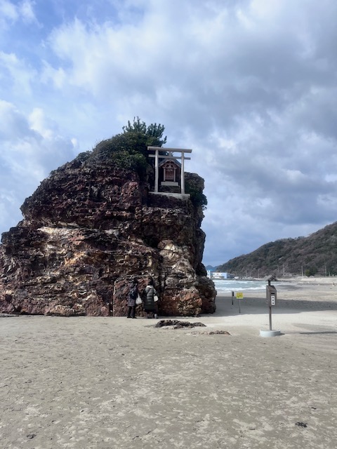 浜には弁天島(小さな岩島)があり、夕暮れ時にはとても神秘的で静かな空気に包まれる場所です。